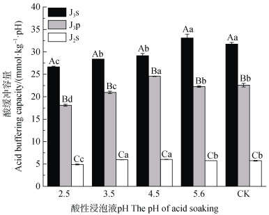 4 结论本研究通过室内的循环浸泡试验和模拟酸雨淋溶试验,以川中地区典型的3组紫色母岩为试验材料,研究不同酸性环境处理对紫色母岩风化产物中酸性缓冲性能、交换性盐基离子及其总量的影响。结果表明:(1)不同酸性环境条件下的母岩风化产物中交换性盐基离子及其总量随处理pH降低而减少。在相同酸度处理24次后,3组紫色母岩风化产物的交换性盐基总量较CK处理均存在不同程度的减小,而且减小幅度随浸泡液酸度的增强而增大,同时,风化产物中的交换性盐基离子含量均表现Ca2+ > Mg2+ > Na+ > K+。此外,模拟淋溶24次后3组紫色母岩风化产物中的交换性盐基总量较模拟淋溶12次均有明显的降低。(2)沙溪庙组(J2s)紫色母岩风化产物的酸缓冲容量最低,其平均值不足遂宁组(J3s)和蓬莱镇组(J3p)紫色母岩风化产物酸缓冲容量的30%,而且3组紫色母岩风化产物的酸缓冲容量与其交换性K+、Na+、Ca2+、Mg2+含量均呈极显著正相关关系(P < 0.01)。此外,遂宁组(J3s)和蓬莱镇组(J3p)风化产物的酸缓冲容量在不同酸处理下的表现特征为:pH5.6 > CK > pH4.5 > pH3.5 > pH2.5。(3)本试验中浸泡处理后3组紫色母岩风化产物酸缓冲容量、交换性盐基离子及盐基总量均高于淋溶处理,表明淋溶处理下的盐基离子的损失高于浸泡处理。可见,丘陵地带坡面的矿物或养分的迁移以淋溶作用为主,平地的矿物或养分的迁移以浸泡作用为主,因此,酸沉降可能在一定程度上加速坡面土壤侵蚀的发生,进而导致平原化进程的加速。