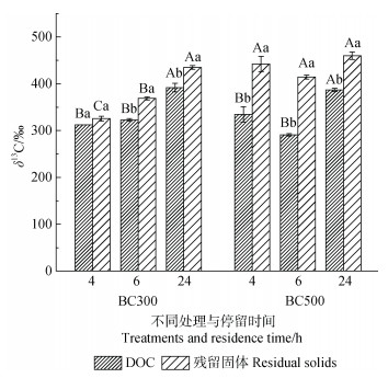 注:不同小写字母表示相同停留时间、相同制备温度的生物质炭,DOC和残留固体之间的显著性差异,P < 0.05;不同大写字母表示相同制备温度的生物质炭的相同组分,不同停留时间之间的显著性差异,P < 0.05。图中误差线为平均值的标准误,n=3。 Note: Within one residence time and one biochar, different lowercase letters denote significant differences between DOC and residual solids, P < 0.05;Within one component of one biochar, different uppercase letters denote significant differences between different residence times, P < 0.05. Vertical bars denote the standard errors of the means, n=3. 图 2 停留时间为4 h、6 h、24 h的标记水稻的地上部分分别在300℃(BC300)和500℃(BC500)制备的生物质炭的热水可提取有机碳(DOC)和残留固体的δ13C Fig. 2 δ13C values of hot water extractable dissolved organic carbon(DOC)and the residual solid of the biochars produced at 300℃(BC300)and 500℃(BC500), respectively from the aboveground tissues of labeled rice plants harvested at residence times of 4 h, 6 h and 24 h, respectively |