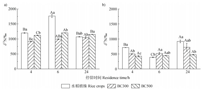 水稻地上部分制备的BC500-δ15N均显著高于BC300-δ15N,这与δ13C的结果相同(图 3a和图 1a)。Taghizadeh-Toosi等[38]使用15N标记后的松树材料制备生物质炭,同样发现高温(500℃)生物质炭-δ15N高于低温(350℃)生物质炭-δ15N。但是,Yuan等[39]的研究认为制备温度越高,生物质炭15N的损失也越多。与水稻植株地上部分的δ15N相比,停留24 h后制备的生物质炭δ15N降幅在3种处理中最低(图 3a),同样,这一现象也出现在生物质炭的δ13C(图 1a),说明延长停留时间能够提高水稻地上部分制备的生物质炭的同位素丰度,减少制备过程中同位素的损失。这可能是因为标记后的停留时间越长,植物同化的15N和13C更多地进入在热解过程中不易损失的植物难分解组分[35-36]。