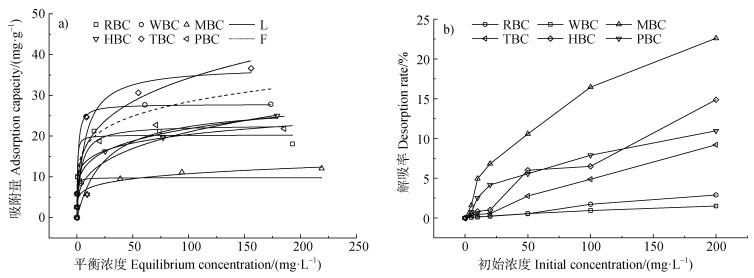 2 结果 2.1 不同生物质炭对溶液中Cd2+吸附-解吸特性的影响生物质炭对Cd2+的吸附等温线如图 1a所示。随着平衡浓度的升高,6种生物质炭对Cd2+的吸附量逐渐增加,一定浓度后吸附达到饱和。6种材料对溶液中Cd2+的吸附能力排序为:TBC > WBC > HBC > PBC > RBC > MBC,TBC吸附能力最强,MBC吸附能力最弱。吸附等温模型拟合分析结果(表 2)可以看出,除MBC、HBC外,Langmuir吸附等温模型对其他4种材料的实验数据拟合度高于Freundlich吸附等温模型,表明生物质炭对Cd2+的吸附以化学吸附为主。根据最大吸附量Qm(表 2)进行吸附能力大小排序为:TBC > WBC > HBC > PBC > RBC > MBC,TBC最大吸附量最高,为37.1 mg·g–1,MBC最大吸附量最低,为9.8 mg·g–1。