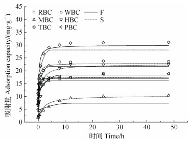 注:F:准一级动力学模型,S:准二级动力学模型。 Note: F: The pseudo-first-order model, S: The pseudo-second-order model. 图 2 不同生物质炭的吸附动力学曲线 Fig. 2 Adsorption kinetic curves of different biochar |