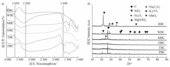 生物质炭的XRD衍射图谱如图 3b所示。各生物质炭在C、Si衍射峰出现峰值,说明生物质炭主要由C、Si化合物组成。此外,各生物质炭在28.3°和32.3°附近出现Na2C6O6和K2CO3衍射峰,RBC、WBC、MBC、TBC、PBC在36.0°出现MnO2衍射峰,MBC在24.2°出现Fe2O3衍射峰。