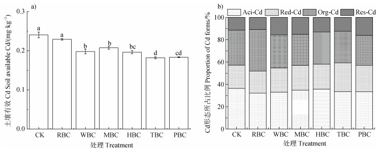 生物质炭的施用不仅降低土壤有效Cd含量,同时也影响土壤Cd的赋存形态。如图 4b所示,本研究中土壤Cd赋存形态主要以酸溶态和可氧化态为主,其次是可还原态和残渣态。与CK相比,施用生物质炭后酸溶态Cd占比下降,降幅为4.7%~24.3%。同时,RBC、TBC处理可还原态Cd含量提升但差异不显著,WBC、MBC、HBC、PBC处理残渣态Cd含量显著提升13.0%~23.0%。由此说明,施用生物质炭后土壤中活性态Cd向稳定态转化,使土壤中Cd的迁移性降低。