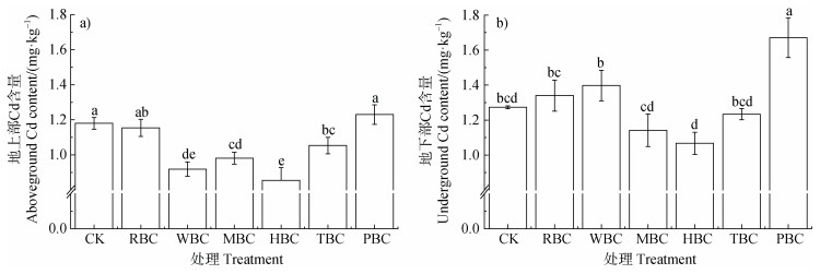 图 5 不同生物质炭处理下植物体内Cd含量的变化(a.地上部,b.地下部) Fig. 5 Changes in Cd content of plants under different biochar treatments(a. aboveground, b. underground) |