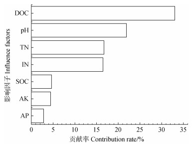 注:DOC:可溶性有机碳,TN:全氮,IN:无机氮,SOC:土壤有机碳,AK:速效钾,AP:有效磷。 Note: DOC: dissolved organic carbon, TN: total nitrogen, IN: inorganic nitrogen, SOC: soil organic carbon, AK: available potassium, AP: available phosphorus. 图 7 土壤理化指标对有效Cd的贡献率 Fig. 7 Contribution rate of soil physical and chemical indexes to available Cd |