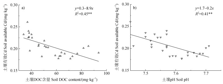将土壤有效Cd分别与土壤DOC、土壤pH线性拟合,结果如图 8所示,土壤有效Cd与土壤DOC、pH呈极显著的负相关关系(P < 0.01)。