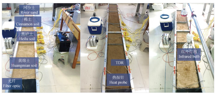 图 1 干土(a)、非饱和土(b、c)水热参数测定试验 Fig. 1 Soil water content and thermal properties measurement under dry soil(a)and unsaturated soil(b, c) |