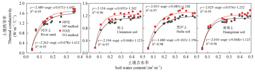 2 结果与讨论 2.1 SPHP-DTS法和HPP法测定土壤热导率的差异利用SPHP-DTS法和HPP法实测土壤在不同水分条件下的热导率,测定结果如图 2所示。可以看出SPHP-DTS法和HPP法测定的土壤热导率随含水率增加均呈指数上升的趋势,且具有较高的拟合度(R2>0.9)。随着含水率增加,土壤热导率的上升速率逐渐降低,表明热导率对含水率的敏感性逐渐降低。这是由于随着土壤含水率增加,颗粒之间形成“水桥”,大大增加了土壤热量传输的途径,因此土壤导热能力迅速增加,热导率随含水率呈指数增长[25]。当含水率增加到一定程度之后,增加的水分渐渐代替了土壤空气,因此,该阶段热导率随含水率增加呈缓慢增长趋势。当土壤饱和后,热导率达到稳定。此外,研究发现,在相同土壤含水率条件下,SPHP-DTS法测定的热导率显著高于HPP法(图 3),河沙土、褐土、黑垆土和黄绵土的SPHP-DTS法较HPP法分别平均高0.073、0.059、0.093和0.096 W·m–1·℃–1。这是因为,SPHP-DTS法加热光纤后温度升高值为5~15℃左右,远大于热脉冲探针法的最高值2℃,使得光纤周围的土壤温度偏高,可从两方面解释SPHP-DTS法的热导率高于HPP法:首先,土壤热导率随温度升高而增大;其次,光纤周围与土壤之间存在较大温度梯度,导致土壤中的水汽潜热传输增强[29]。