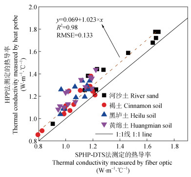 图 3 SPHP-DTS法和HPP法测定的热导率之间的关系 Fig. 3 Relationship between thermal conductivity measured by fiber optic and heat probe methods |
