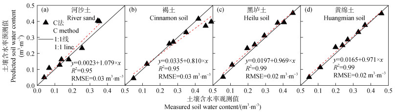 本研究采用基于HPP的热容法(C法)测定了4种类型土壤的含水率,相比于传统的时域反射法(TDR),河沙土、褐土、黑垆土和黄绵土的均方根误差(RMSE)分别为0.03、0.03、0.02、0.02 m3·m–3,测定精度与Tarara和Ham[30]的研究结果一致。在整个含水率范围内,土壤含水率观测值与预测值的散点均靠近1︰1线(图 4),因此C法测定土壤含水率具有很高的测量精度。