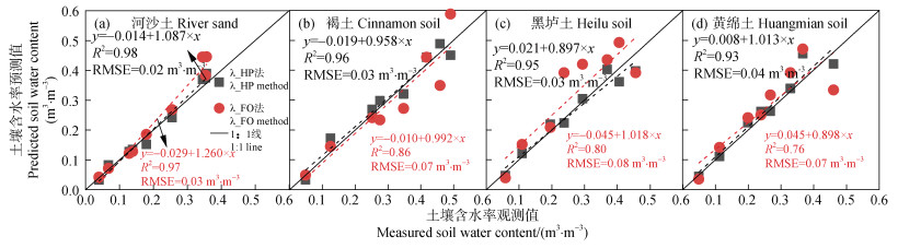 因此,为提高SPHP-DTS在λ_FO法下的土壤含水率测量精度,有必要以HHP法为基准对SPHP-DTS法测定的热导率进行校正,从而提高HHP法的土壤含水率测定精度。从本研究可以看出,HHP法对不同质地类型土壤的水分测定具有很高精度(RMSE小于0.05 m3·m–3)。目前许多学者[16-17]建立了具有物理意义的热导率模型λ(θ),为SPHP-DTS法水分测定提供了可靠的模型基础。因此,在热导率准确测定的前提,SPHP-DTS法测定土壤含水率具有广阔的应用前景。