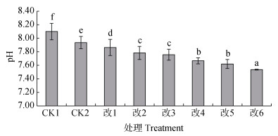 2 结果 2.1 施用磷石膏改良剂对滨海盐土pH的影响结果表明,田间试验土壤pH与施用的磷石膏用量呈负相关,施用磷石膏改良剂处理的表层土壤pH较对照CK2(施肥,不施用磷石膏)下降了0.07、0.15、0.18、0.27、0.32、0.40,降幅分别为0.92%、1.93%、2.27%、3.40%、3.99%、5.04%,最大降幅为改6,较对照CK1下降更多。对照CK2的pH与对照CK1(不施肥不施用磷石膏)相比也是下降的,降幅为2.02%,说明施用复合肥也能在某种程度上降低土壤pH。图 1反映了盐土施用施磷石膏后土壤pH的变化趋势,从图中可以看出,随着磷石膏的用量增加,土壤的pH逐渐降低,处理间差异显著(P < 0.05),改2和改3之间差异不显著,改4和改5之间差异不显著,其余处理之间差异显著(P < 0.05)。改6降低pH效果最好。这是因为磷石膏本身是呈酸性的,施入土壤后一方面磷石膏中的游离酸可以快速中和土壤碱度,这对土壤改良是有益的;另一方面,磷石膏中的硫酸钙与土壤中的碳酸氢根和碳酸根离子发生化学反应,生成碳酸钙和碳酸氢钙,这两种物质均难溶于水,导致土壤pH下降。同时由于磷石膏含有大量的可溶性钙离子,会与土壤胶体上的钠离子进行交换,钠离子被交换下来随灌溉降雨淋洗,从而减少表层土壤钠离子含量,也会导致表层土壤pH下降。土壤pH过高影响植物根系细胞膜通透性,从而影响植物对养分的吸收。