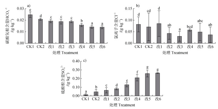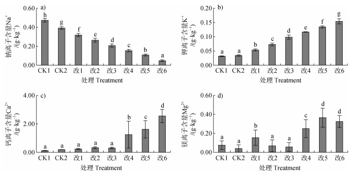 土壤中碳酸氢根过高容易表现出碱害,不利于植物生长。滨海盐土施入磷石膏后碳酸氢根离子含量与不施磷石膏处理之间有显著差异(P < 0.05),但不同用量改良剂之间差异大小不一,改1、改2、改3之间的差异不显著,改5、改6之间的差异也不显著,其余差异显著。从图 3a可以看出,碳酸氢根离子含量以CK1最高,施入复合肥和磷石膏改良剂后,土壤中的碳酸氢根离子是有所下降的,与CK1相比,各处理下降幅度分别为15.81%、21.97%、24.02%、23.61%、35.93%、42.51%、43.53%,下降幅度大小排列为改6 > 改5 > 改4 > 改2 > 改3 > 改1 > CK2,下降幅度最大的为改6,最小的为CK2。施入磷石膏之后,土壤中的碳酸氢根离子含量有显著降低趋势,可能是由于磷石膏中的酸与重碳酸根发生中和反应所致。土壤中的CO32–和HCO3–含量的多少是决定盐碱地土壤pH高低及理化性状好坏的重要因素,本试验表明,施用磷石膏能降低土壤中碳酸氢根离子的含量,从而达到改良盐碱地理化性状的目的。