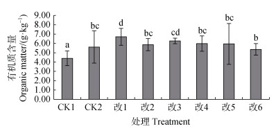 2.3 施用磷石膏改良剂对土壤有机质的影响施用磷石膏后影响土壤有机质,试验结束后表层土壤有机质含量依次为4.40、5.61、6.71、5.87、6.27、5.98、5.95、5.36 g·kg–1。施磷石膏改良剂的处理有机质较CK2分别增加19.50%、4.51%、11.59%、6.58%、5.93%、-4.54%,增加幅度最大的为改3,改6的有机质含量较CK2下降了4.54%。CK2的有机质含量较CK1增加27.57%,说明施用磷石膏改良剂能显著提高土壤的有机质(图 4)。各处理有机质含量较不施肥、未施用磷石膏的对照CK1均有显著增加(P < 0.05),这可能是施用复合肥和磷石膏的田块小麦生长好于对照CK1和CK2,小麦在生长过程中向土壤中分泌了较多的根系分泌物,这些分泌物大多为有机物。