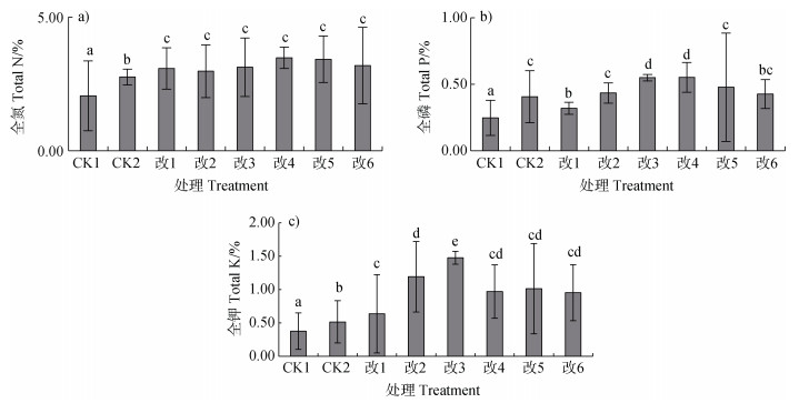 2.4.3 不同处理对小麦叶片全钾的影响在8个处理中,施用磷石膏处理的小麦叶片全钾含量均显著高于未施磷石膏处理即CK1和CK2(P < 0.05)。改1、改2、改3、改4、改5、改6与CK1相比,全钾增加幅度分别为23.60%、131.31%、186.25%、88.01%、96.34%、84.66%,增加幅度最高的为改3,最小的为改1,CK2的全钾较CK1增加了37.28%(图 5c)。随着磷石膏的施用量增加,小麦叶片中全钾基本表现出先升高再降低的趋势,其中改3的全钾含量最大,较CK1增加了186.25%。结果表明,施用磷石膏能有效促进小麦对土壤中钾的吸收,但过量施用磷石膏反而下降,增加最多的处理是改3,与全氮、全磷的结果不一致。施用磷石膏改良剂能增加小麦叶片中全钾含量,促进小麦的生长。