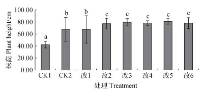2.5 施用磷石膏改良剂对小麦生长的影响 2.5.1 磷石膏对小麦株高的影响在8个处理中,施用磷石膏处理的小麦株高均显著高于不施肥不施用磷石膏对照CK1(P < 0.05),也均高于不施肥但是施用磷石膏对照CK2(改1除外),增减幅度分别为–0.39%、13.74%、17.22%、15.36%、19.04%、14.82%,增加幅度最大的是改5,改6与改5相比有所下降,CK2较CK1增加61.11%(图 6)。且与CK2差异显著,但改2、改3、改4、改5、改6之间的差异不显著。说明施用磷石膏改良剂能有效促进小麦生长,增加小麦的株高,但是过量施用磷石膏不再提高小麦株高,本试验中改5小麦株高最高。