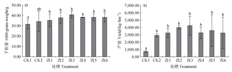 磷石膏改良剂能增加小麦千粒重,施用磷石膏处理小麦千粒重均高于不施用磷石膏的对照CK2,增加幅度分别为3.21%、10.60%、19.36%、11.87%、12.16%、11.87%,增加最高的是改3处理,CK2较CK1增加8.32%。方差分析显示,跟对照CK2相比,处理之间的千粒重差异不明显(P > 0.05),原因有可能是用磷石膏改良只经过一个生长季,在作物身上表现得还不明显(图 7a)。各处理千粒重表现出先升高再降低的趋势,改3的千粒重是最高的,但从图上看差异不是很大。