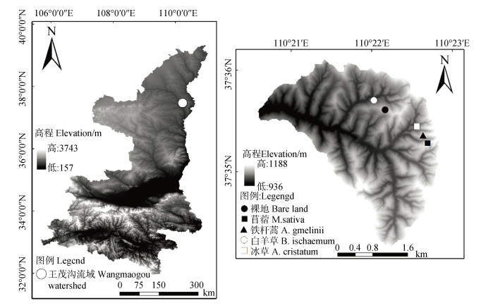 1 材料与方法 1.1 研究区概况研究区位于黄土丘陵区的王茂沟小流域,面积为5.97 km2,海拔为936~1 188m。属大陆季风性气候,多年平均气温10.2℃,平均降水量513 mm,多集中在汛期(6—9月)。土壤以黄绵土为主,抗侵蚀能力较弱。20世纪90年代,为响应国家退耕还林(草)政策,该流域部分坡耕地通过自然或人工恢复的方式逐渐转变为草地。截至2017年,草地是流域内的主要土地利用类型(36.51%),高于其他土地利用类型[15]。根据陕北黄土丘陵区的撂荒演替序列[16],流域内天然草地已演替至中后期,代表性植物种为冰草、铁杆蒿、白羊草。而人工草地的代表性植物种为苜蓿。