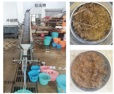 (4) 根系参数。根长密度(RLD,cm·cm–3):在每次冲刷试验结束后,将样品置于0.5mm的筛网上反复冲洗,洗出样品中的根系,并去除杂物。将洗干净的根平铺于透明胶片上,放入扫描仪(日本EPSON Perfection V700 PHO-TO)。用万深LA-S系列植物图像分析仪对扫描得到的图像进行分析,得到根长数据,根长与取样环刀体积的比值即为根长密度[4]。