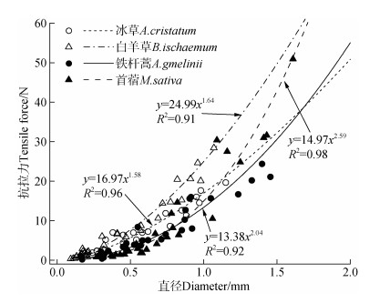 须根系属纤维根系,其纤维素含量高于直根系[23]。由于根系抗拉力与纤维素含量呈正相关关系[24],因此本研究中,当根径较小时,须根系冰草和白羊草的单根最大抗拉力高于直根系的铁杆蒿和苜蓿。随着根径的增加,根系木质素含量增加,纤维素含量减小[25],此时直根系的木纤比高于须根系[26],使得须根系的抗拉强度较高,而抗拉力与抗拉强度呈反比[19]。因此根径较大时,须根系的单根抗拉力低于直根系。