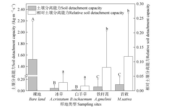 注:不同大写字母表示不同样地类型土壤分离能力差异显著(P < 0.05),不同小写字母表示不同样地类型相对土壤分离能力差异显著(P < 0.05)。 Note: Different capital letters indicate significant differences at a confidence level of 0.05 between the SDCs, and different lowercase letters indicate significant differences at a confidence level of 0.05 between the RSDs. 图 4 不同样地的土壤分离能力 Fig. 4 Soil detachment capacity under different sampling sites |