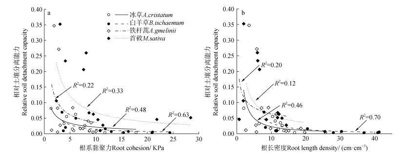 在铁杆蒿和苜蓿样地,相对土壤分离能力与根系黏聚力的相关性高于与根长密度的相关性(表 3)。在冰草样地,相对土壤分离能力与根系黏聚力的相关性高于与根长密度的相关性,白羊草样地,二者关系无显著差异。说明根系黏聚力对直根系草地的相对土壤分离能力的表达效果优于根长密度。