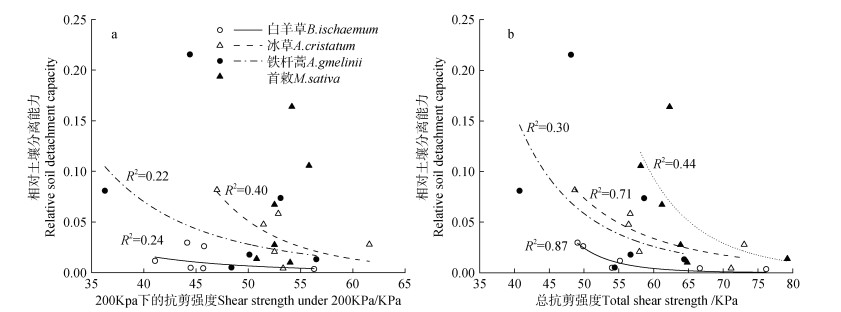 对相对土壤分离能力与不同正应力下的土壤抗剪强度进行相关性分析(表 4)。除冰草外,白羊草、铁杆蒿、苜蓿样地的相对分离能力与正应力为200 KPa下的抗剪强度相关性最高,甚至优于与土壤黏结力(便携式剪切仪测定)的相关性。因此选用200 KPa下的抗剪强度作为土壤抗剪强度的表征参数,探究其与土壤分离能力的关系。