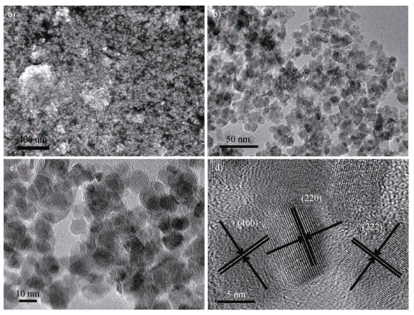图 2a为Fe3O4NPs的扫描电镜照片,可看到Fe3O4NPs为比较小的颗粒形状,分布较为均匀。为进一步观察其形貌和结构,对样品进行了透射电镜的表征。在透射电镜下,Fe3O4NPs的大小和形状更为清晰,呈类球形颗粒状,直径大约10 nm,分布较为均匀(图 2b,图 2c),其结果和扫描电镜的结果相一致。图 2d是对应的透射电镜的高分辨照片,可看到清晰的Fe3O4NPs的晶格条纹,分别对应于(400)、(220)和(222)晶面,进一步证实了Fe3O4NPs的成功合成。