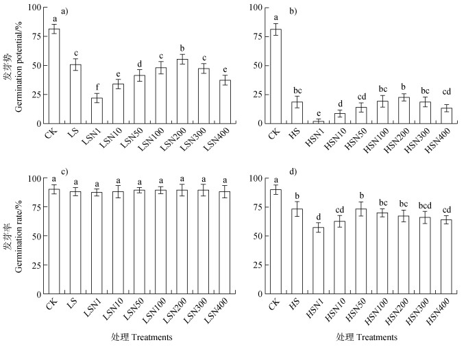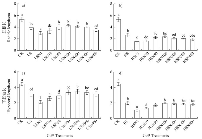 注:LS、LSN1、LSN10、LSN50、LSN100、LSN200、LSN300、LSN400处理分别表示1、10、50、100、200、300、400 mg·L–1 Fe3O4NPs浸种后统一用低盐(100 mmol·L–1 NaCl)处理。HS、HSN1、HSN10、HSN50、HSN100、HSN200、HSN300、HSN400处理分别表示1、10、50、100、200、300、400 mg·L–1 Fe3O4NPs浸种后统一用高盐(150 mmol·L–1 NaCl)处理。CK为清水浸种后,不加NaCl的蒸馏水处理。图柱上不同的小写字母表示处理间差异显著(P < 0.05)。下同。 Note: The treatments of LS, LSN1, LSN10, LSN50, LSN100, LSN200, LSN300, and LSN400 represent 1, 10, 50, 100, 200, 300, and 400 mg·L–1 Fe3O4NPs soaking seeds, respectively, and uniformly treated with low salt(100 mmol·L–1 NaCl)after soaking. Treatment with HS, HSN1, HSN10, HSN50, HSN100, HSN200, HSN300, and HSN400, respectively, indicated that 1, 10, 50, 100, 200, 300, and 400 mg·L–1 Fe3O4NPs soaking seeds, and uniformly treated with high salt(150 mmol·L–1 NaCl). CK represent seeds soaked in and treated with distilled water. The different lowercase letters on the column in Figure 1 indicate significant differences between treatments(P < 0.05). The same below. 图 3 低盐(100 mmol·L–1 NaCl,a、c)和高盐(150 mmol·L–1 NaCl,b、d)胁迫下不同浓度Fe3O4NPs浸种对番茄种子发芽势(a、b)和发芽率(c、d)的影响 Fig. 3 Effects of soaking seeds with different concentrations of Fe3O4NPs on germination potential (a, b) and germination rate(c, d) of tomato seeds under low salt stress (100 mmol·L–1 NaCl, a, c) and high salt stress (150 mmol·L–1 NaCl, b, d) |
