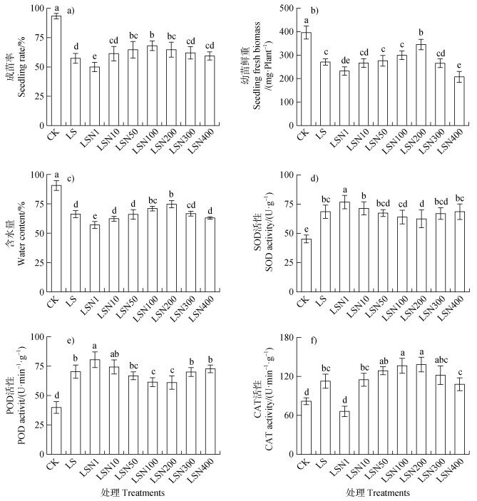1.4 砂培试验设计与处理种子前处理同1.3。浸种后取出种子清洗干净,吸水纸吸干,分别播种至装有砂子的盆中,每盆播种40粒,播种深度1 cm,播种后即用含100 mmol·L–1 NaCl的1/10霍格兰(Hoagland)溶液缓缓浇灌,浇透。这样构成LS、LSN1、LSN10、LSN50、LSN100、LSN200、LSN300、LSN400等不同处理,以不用NaCl和Fe3O4NPs浸种的处理为对照(CK)。每个处理设置3个重复。置于温室中自然光照处理18 d,统计成苗率并取样,进行相关测定。整个处理过程中,每隔1 d,更换一次处理溶液。