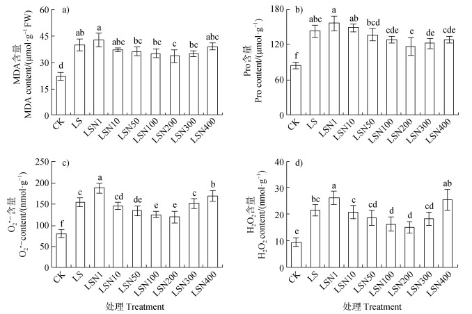 砂培条件下盐胁迫萌发试验显示,盐胁迫明显增加番茄幼苗的MDA、Pro、O2·-和H2O2含量,辅以不同浓度纳米级Fe3O4浸种,也展示了不同情况的调控效应(图 6)。盐胁迫下,1 mg·L–1 Fe3O4NPs(LSN1)处理下,膜脂过氧化产物MDA、细胞渗透调节保护物质及自由基清除剂Pro、活性氧(O2·-和H2O2)含量均进一步上升,其中O2·-和H2O2含量的上升均达到显著水平,显示了典型的次生氧化胁迫特征;随着Fe3O4NPs浸种浓度上升,MDA、Pro、O2·-和H2O2含量逐渐下降,200 mg·L–1 Fe3O4NPs(LSN200)处理下幼苗MDA、Pro、O2·-和H2O2含量均达到最低值(图 6),表明氧化胁迫得以明显缓解。