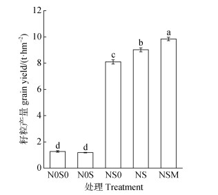 N0S0处理籽粒产量为1.27 t·hm–2,与N0S0处理相比,NS0、NS和NSM处理籽粒产量显著升高,分别增加6.83、7.75和8.57 t·hm–2,而N0S处理籽粒产量与N0S0处理无显著差异(P > 0.05,图 1)。