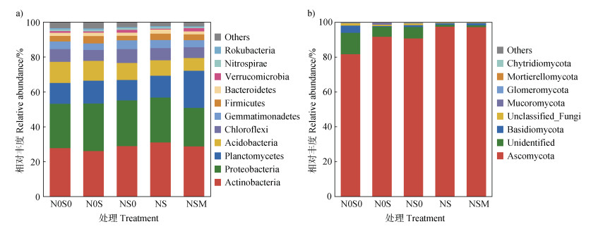 真菌高通量测序序列经过物种注释后归属于9个门、21个纲、61个目、145个科和297个属。各处理的真菌优势菌门均为子囊菌门(Ascomycota),占真菌总丰度的81.89%~97.66%,其次为担子菌门(Basidiomycota),占真菌总丰度的0.42%~4.13%(图 2b)。方差分析结果表明,与N0S0处理相比,N0S、NS0、NS和NSM处理的子囊菌门相对丰度显著增加,分别增加12.17%、10.96%、19.27%和18.92%;担子菌门的相对丰度在各处理间差异未达到显著水平。
