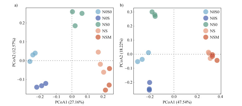 对各处理的细菌和真菌群落组成进行PCoA分析,主坐标的第一轴和第二轴分别解释了细菌群落结构27.16%和12.57%的总方差(图 3a);主坐标第一轴和第二轴分别解释了真菌群落结构47.54%和18.22%的总方差(图 3b)。5个处理的细菌和真菌群落均可分为N0S0+N0S、NS0以及NS+NSM三组,置换多元方差分析(PERMANOVA)表明,在细菌和真菌群落中,N0S0和N0S处理的群落组成相似,NS和NSM处理的群落组成相似,N0S0+N0S、NS0以及NS+NSM三组之间的群落组成两两差异显著。
