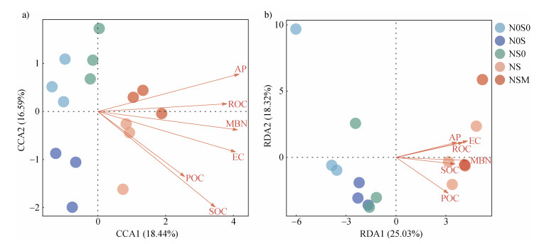有机碳可分为活性有机碳和难降解有机碳,农田土壤活性有机碳包括DOC、MBC、POC和ROC等,可被作物吸收和利用,并且是土壤细菌和真菌生长的重要能量来源[3]。本研究中,NS和NSM处理的DOC、MBC和ROC含量相较N0S和NS0处理显著升高(表 1),这可能由于秸秆和鸡粪的施入提供了包含多种土壤碳组分的有机碳化合物,并增加了作物根系生物量及根系分泌物,使土壤中活性有机碳组分含量增加[7]。此外,秸秆和鸡粪分解过程中释放的大量营养物质,增加了微生物生长所需的养分供应,促进了微生物的活动,微生物将秸秆和粪肥中的碳转化为了不稳定形式的有机碳[7]。Liu等[3]研究发现化肥配施秸秆可加速有机碳矿化和有机质分解,并释放活性有机碳成分,相较单施化肥显著提高了DOC、MBC、POC和ROC含量,与本研究结果相似。
