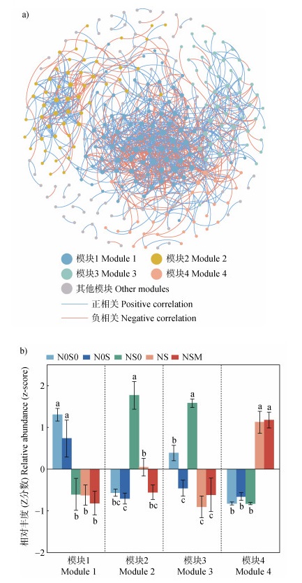图 5a所示,利用斯皮尔曼相关关系构建细菌-真菌共现网络,网络中细菌种类占56.36%,真菌种类占43.64%。网络相关关系中,61.12%为正相关关系,38.88%为负相关关系,表明微生物之间的协同作用高于竞争作用。网络主要分为4个较大的模块,模块1中,N0S0和N0S处理的相对丰度显著高于NS0、NS和NSM处理;模块4中,NS和NSM处理的相对丰度显著高于N0S0、N0S和NS0处理;模块2和模块3则表现为NS0处理的相对丰度显著高于其他处理(图 5b)。