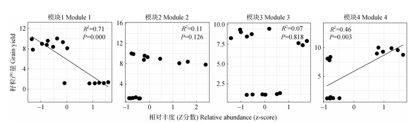 线性回归分析表明,模块1相对丰度与籽粒产量呈显著负向线性关系,模块4相对丰度与籽粒产量呈显著正向线性关系(图 6),而模块2和模块3的相对丰度与小麦产量相关性不显著。因此,模块1和模块4为影响小麦产量的关键模块。