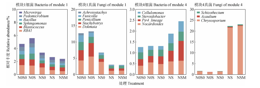 方差分析结果表明,模块1优势细菌中,NS和NSM处理的RB41、芽球菌属(Blastococcus)、鞘氨醇单胞菌属(Sphingomonas)和芽孢杆菌属(Bacillus)相对丰度显著低于N0S0和NS0处理。模块1优势真菌中,NS和NSM处理的Dokmaia、葡萄穗霉属(Stachybotrys)和无色穗孢属(Achroiostachys)相对丰度显著低于N0S0和NS0处理,Fusicolla相对丰度显著低于N0S0处理。模块4优势细菌中,NS和NSM处理的类诺卡氏菌属(Nocardioides)相对丰度显著高于N0S0和NS0处理,纤维单胞菌属(Cellulomonas)相对丰度显著高于N0S0、N0S和NS0处理;NSM处理的类固醇杆菌属(Steroidobacter)相对丰度显著高于N0S处理,Pir4_lineage相对丰度显著高于其他4个处理。模块4优势真菌中,NS和NSM处理的真菌金孢子菌属(Chrysosporium)、无茎真菌属(Acaulium)和裂壳菌属(Schizothecium)相对丰度显著高于N0S0、N0S和NS0处理(图 7)。