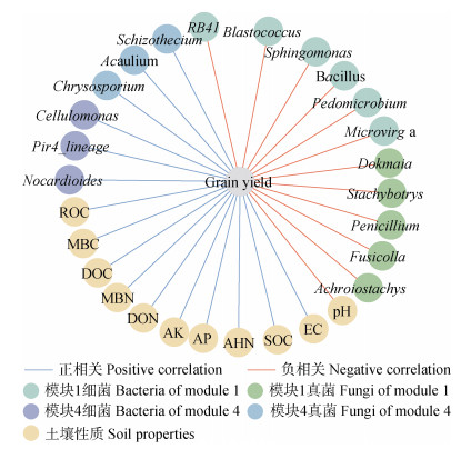 2.5 模块差异优势属及土壤性质与产量的关系如图 8所示,聚焦于模块中相对丰度在各处理间存在差异的优势属,皮尔森相关性分析表明,模块1的差异优势属中,RB41、芽球菌属(Blastococcus)、鞘氨醇单胞菌属(Sphingomonas)、芽孢杆菌属(Bacillus)、土微菌属(Pedomicrobium)、微枝形杆菌属(Microvirga)、Dokmaia、葡萄穗霉属(Stachybotrys)、青霉属(Penicillium)、Fusicolla和无色穗孢属(Achroiostachys)与籽粒产量显著负相关。模块4的差异优势属中,类诺卡氏菌属(Nocardioides)、Pir4_lineage、纤维单胞菌属(Cellulomonas)、金孢子菌属(Chrysosporium)、无茎真菌属(Acaulium)和裂壳菌属(Schizothecium)与籽粒产量显著正相关。土壤性质中,EC、SOC、AHN、AP、AK、DON、MBN、DOC、MBC和ROC与籽粒产量显著正相关,pH与籽粒产量显著负相关。