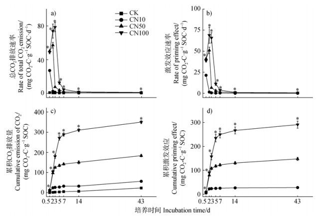 式中,Et为培养期间添加葡萄糖处理中土壤呼吸产生的CO2,mg CO2- C·g–1 SOC;Ec为培养期间未添加葡萄糖处理中CO2排放量,mg CO2- C·g–1 SOC。