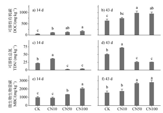 处理、时间均显著影响DOC、TDN、MBC含量(表 2)。14 d时,CN100处理下DOC相较于CN10和CK显著提升了80.5%和245.1%;43 d时,CN100和CN50处理下DOC显著高于CN10的25.2%和29.8%(图 2a和图 2b)。在两次破坏性取样时,各处理之间TDN差异规律表现一致,CN100和CN50处理在14 d时较CN10显著降低了88.9%和93.5%,在43 d时较CN10处理显著降低了63.9%和64.1%(图 2c和图 2d)。相反的是,在培养过程中CN100和CN50处理均相较于CN10显著提升了MBC(图 2e和图 2f)。