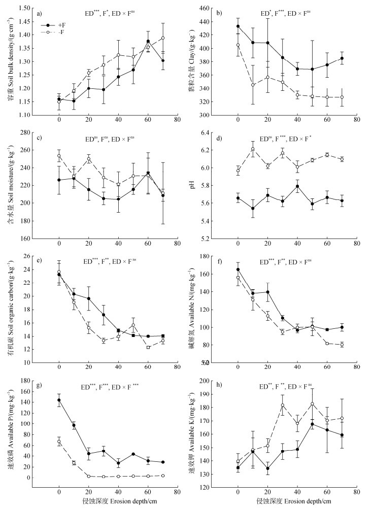 试验小区建立初期3年(2005—2007年)研究表明,随侵蚀深度增加,土壤容重显著增加,土壤黏粒、有机质、速效氮、速效磷含量均显著下降,但pH和速效钾含量无显著变化[13]。本研究在18年后的模拟侵蚀和施肥条件下,土壤容重、pH、黏粒含量、有机碳、碱解氮、速效磷的变化与上述研究相同,但侵蚀导致速效钾含量显著上升(图 1)。这与前人研究发现的随开垦历史延长速效钾含量增加[23]一致。推测连年耕作及冻融交替导致底土中富含钾的矿物K+释放量增加,且严重侵蚀下作物携出量降低,从而导致严重侵蚀下土壤速效钾含量增加。施肥导致土壤容重、pH、速效钾含量显著下降,黏粒含量和有机碳、碱解氮、速效磷含量显著增加(图 1)。施肥处理高的根系生长可能降低了土壤容重,土壤酸化导致矿物中K+释放,经土壤淋溶作用造成土壤速效钾含量下降。