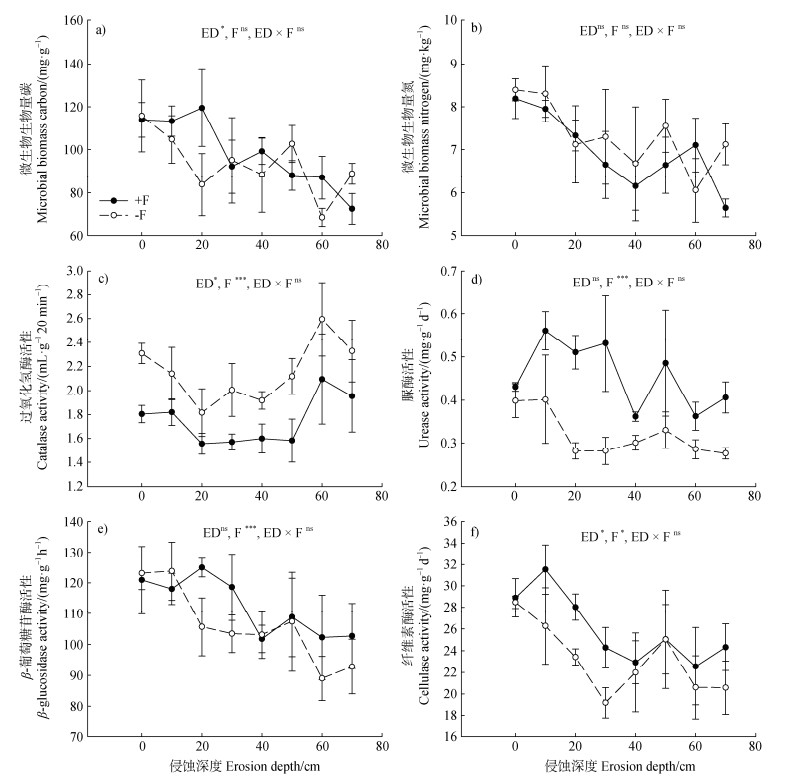 土壤生物性质方面(图 2),侵蚀程度显著影响微生物生物量碳含量、过氧化氢酶和纤维素酶活性(P < 0.05)。随侵蚀深度增加,微生物生物量碳含量和纤维素酶活性显著下降,但过氧化氢酶活性则呈现U型变化,过氧化酶活性在侵蚀深度小于20 cm时随侵蚀深度增加而下降,侵蚀深度20~50 cm间变化不明显,此后随侵蚀深度增加而增加。施肥对微生物生物量碳和微生物生物量氮含量影响不显著,但显著影响4种酶的活性(过氧化氢酶、脲酶和β-葡萄糖苷酶活性:P < 0.001;纤维素酶活性:P < 0.05)。施肥显著降低了过氧化氢酶活性,但增加了脲酶、β-葡萄糖苷酶、纤维素酶活性。侵蚀和施肥的交互作用对微生物生物量碳、微生物生物量氮含量和4种酶活性影响均不显著。