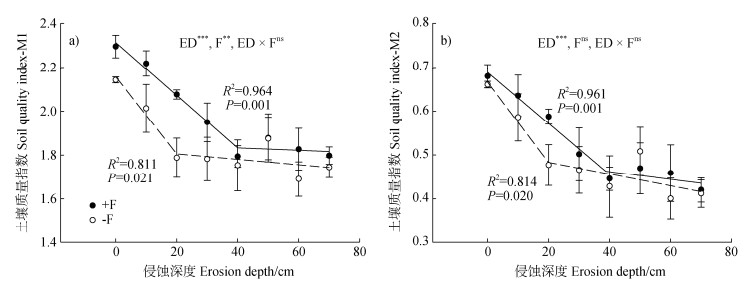 利用双因素方差分析评价侵蚀程度和施肥对土壤理化生性质、土壤质量指数和玉米产量的影响,利用皮尔森(Pearson)相关分析研究土壤理化性质间相互关系,利用两段线性函数对土壤质量指数和玉米产量进行模拟,求得土壤质量和玉米产量骤降的阈值深度。利用多元线性回归中的进入法和逐步分析法寻求影响施肥和不施肥条件下土壤质量与产量的关键因素。两段线性函数模拟用Sigmaplot 10.0软件外,其他均用SPSS14.0软件进行。图中土壤性质、土壤质量指数和产量数据均为平均值±标准误。