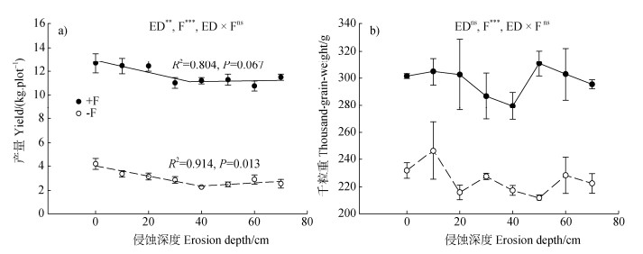 模拟侵蚀深度和施肥对玉米产量均有极显著影响(侵蚀深度:P < 0.01;施肥:P < 0.001),且施肥对产量的影响大于侵蚀深度(图 4a)。随侵蚀深度增加,玉米产量逐渐下降,且其下降主要发生在侵蚀深度为39.5 cm(不施肥处理)和35.6 cm(施肥处理)之前。侵蚀深度40 cm时,不施肥处理和施肥处理的产量分别下降45.8%和11.7 %。施肥显著提升玉米产量,与不施肥处理相比,在侵蚀深度为0、10、20、30、40、50、60、70 cm时,施肥处理的玉米产量较不施肥处理玉米产量分别增加2.0倍、2.7倍、3.0倍、2.9倍、3.9倍、3.5倍、2.7倍和3.5倍,平均增加3.0倍,且在侵蚀深度40~70 cm时的产量增加幅度要高于0~30 cm。侵蚀对千粒重无显著影响(图 4b),推测模拟侵蚀下产量的降低主要是穗粒数的减少(单位面积的穗数相对稳定),而施肥对产量的提升与千粒重的增加密切相关。