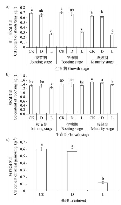 1.4 小麦各部分Cd含量的测定小麦地上部分、根和籽粒研磨成粉末状后,分别准确称取0.1~0.2 g(精确至0.000 1 g),使用5 mL硝酸+ 1 mL过氧化氢,经微波消解仪消解后用体积分数2%硝酸定容至10 mL[19],采用电感耦合等离子体质谱仪(ICP-MS,Nex ION,Perkin Elmer,美国)检测上清液中Cd的浓度[20],进而换算出各部位Cd含量。选择GBW10011a(国家标准物质网)作为供试小麦样品Cd含量的质量控制标准,标准物质的回收率为91%~102%。