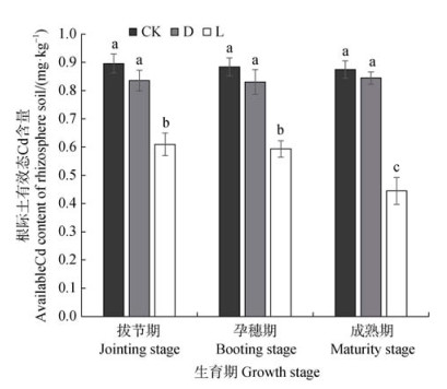 如图 2所示,不接菌对照处理及接灭活菌处理根际土壤Cd含量随着生育期的延长无显著变化。与对照组相比,接种活菌处理使小麦根际土壤有效态Cd含量降低了32%~49%。接种灭活菌处理对小麦根际土壤有效态Cd含量的影响不显著。接种活菌处理成熟期根际土壤Cd含量显著低于拔节期和孕穗期,拔节期至孕穗期根际土壤Cd含量无显著变化。