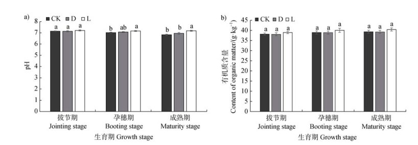 如图 3a所示,随着生育期的延长不接菌对照处理和接灭活菌处理根际土壤pH呈现出下降的趋势,接活菌处理组根际土pH在不同生育期无显著变化。尤其成熟期,接活菌处理较不接菌处理使小麦根际土壤pH显著提高5%。在整个生育期中,不同处理间根际土壤的有机质含量无显著差异(图 3b)。