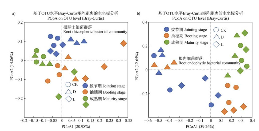 图 4 不同处理条件下根际土壤(a)与根内生(b)细菌群落的主坐标分析(PCoA) Fig. 4 Principal coordinate analysis(PCoA)plot depicts the Bray-Curtis distance between rhizosphere soil(a)and root endophytic(b)bacterial communities under different treatment conditions |
