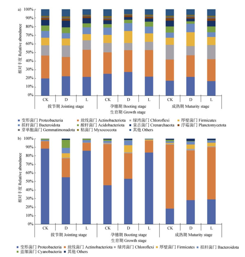 图 5 不同处理条件下根际土壤(a)与根内生(b)细菌群落优势菌门相对丰度的变化 Fig. 5 Changes in the relative abundances of abundant phyla of rhizosphere soil(a)and root endophytic(b)bacterial communities under different treatments |